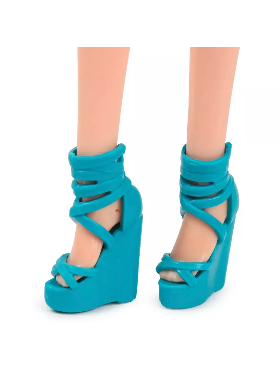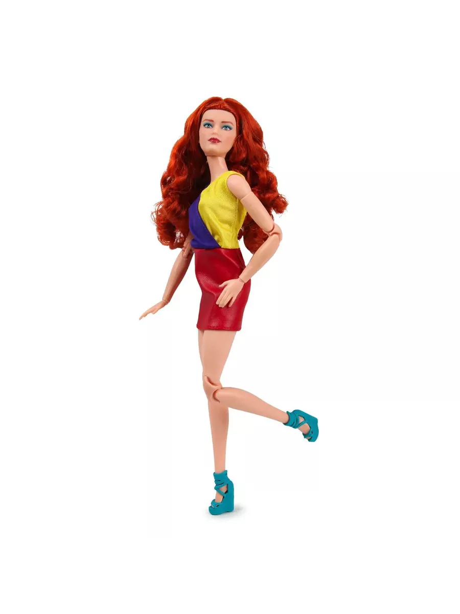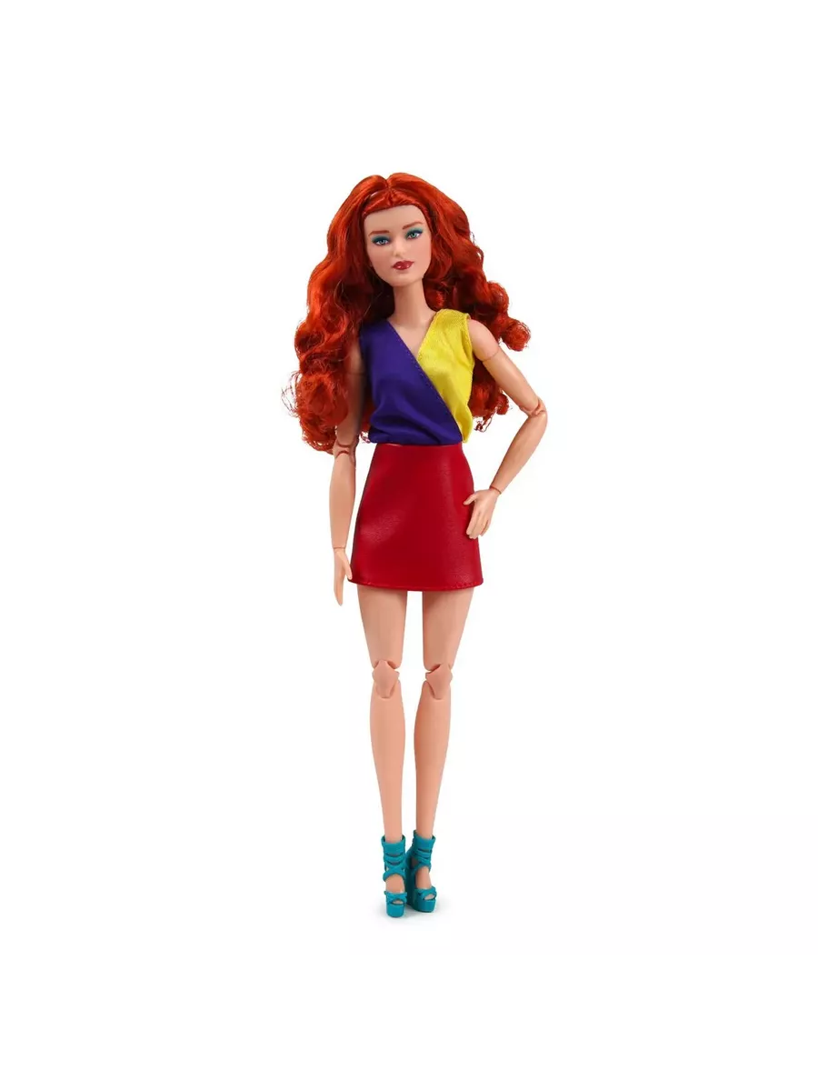 У Barbie великолепные рыжие волосы с объемными локонами, ниспадающими на плечи. У нее синие тени для век и гранатовые губы.