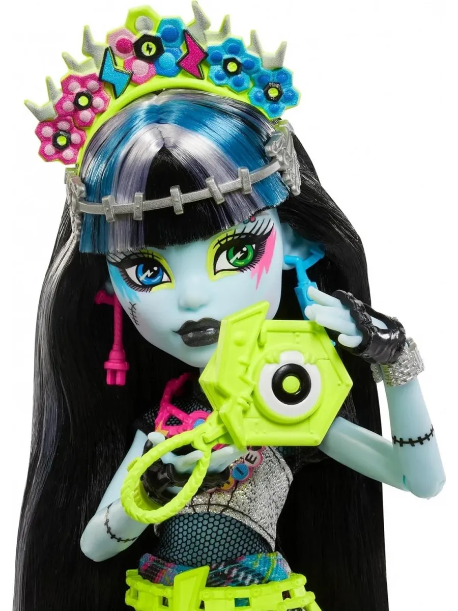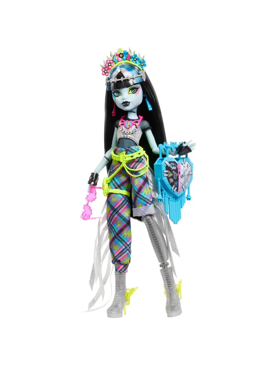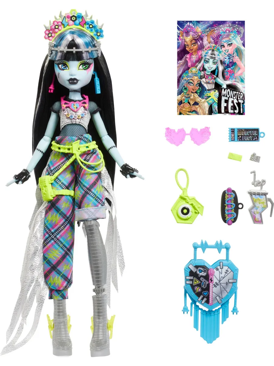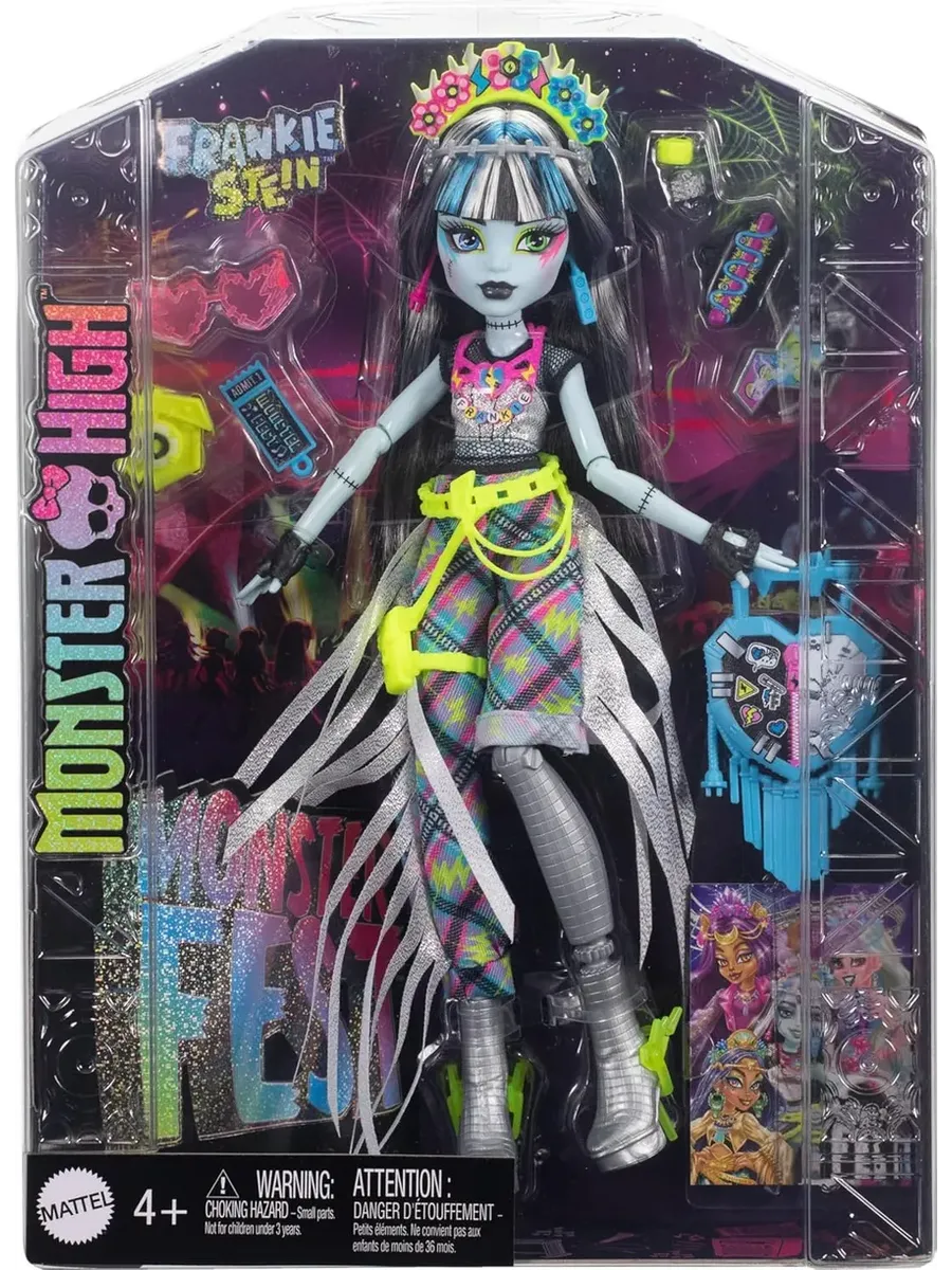 Фрэнки Штейн, ученица школы Monster High, отправляется на Monster Fest — самый крутой музыкальный фестиваль! Она собирается петь, танцевать, наслаждаться вкусной едой и веселиться с друзьями. Для этого Фрэнки выбрала сногсшибательный наряд: сетчатый топ, асимметричные брюки с бахромой и ярким узором в клетку и ботинки, украшенные как диско-шар. Образ дополняют разнообразные аксессуары: цветочная повязка на голове, неоновая поясная сумка, длинные серьги и сумка в виде сердца. Для фото на память Фрэнки взяла с собой моментальный фотоаппарат.
