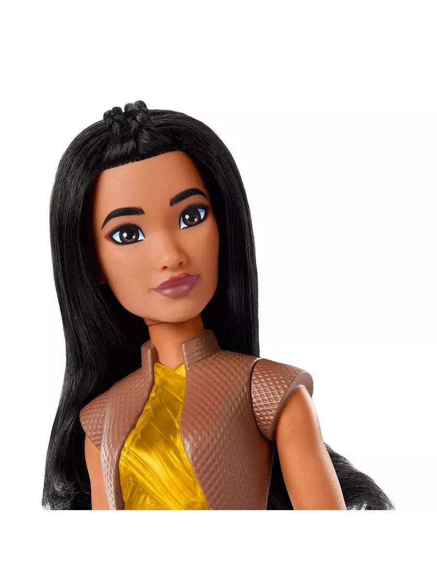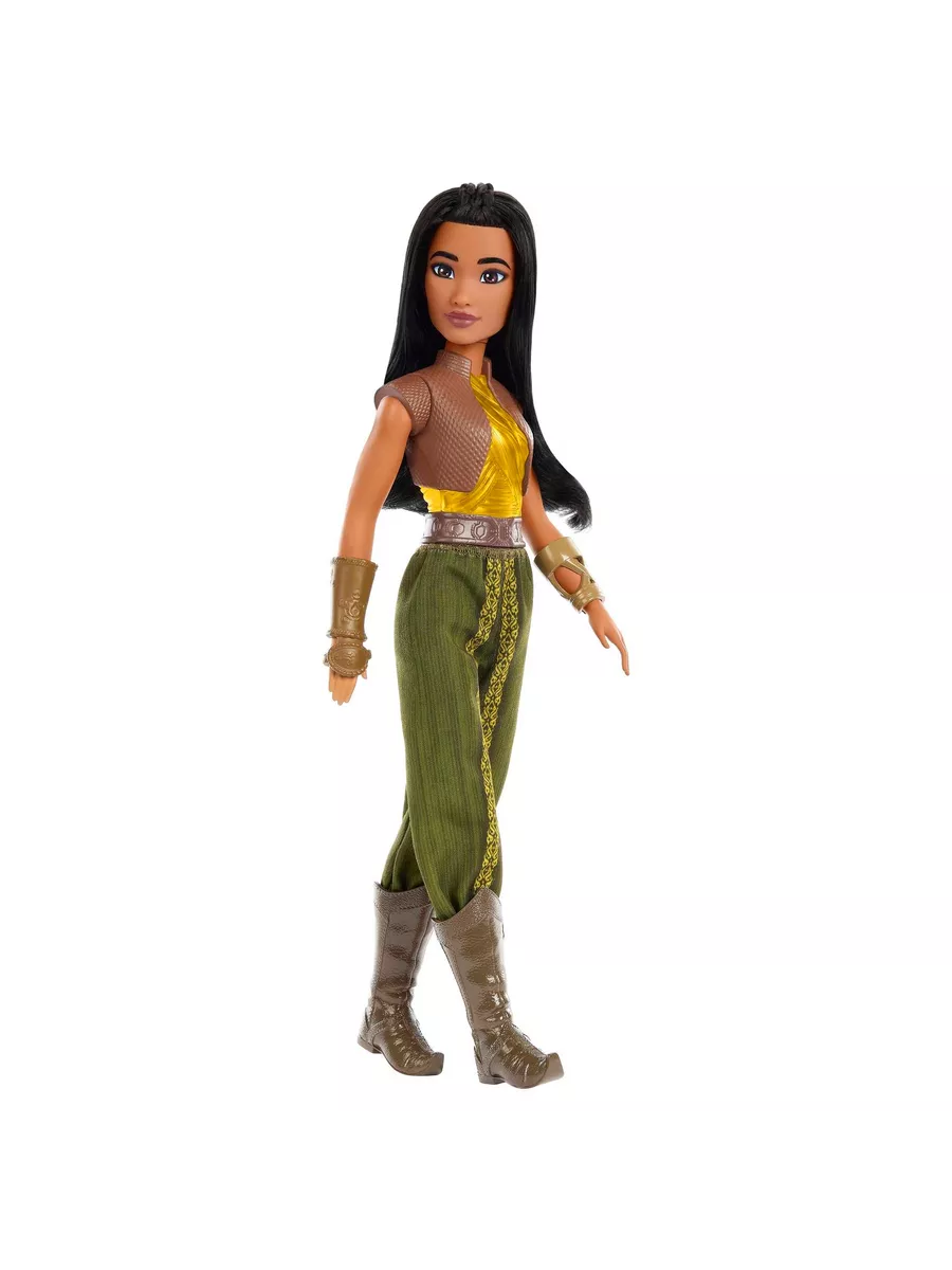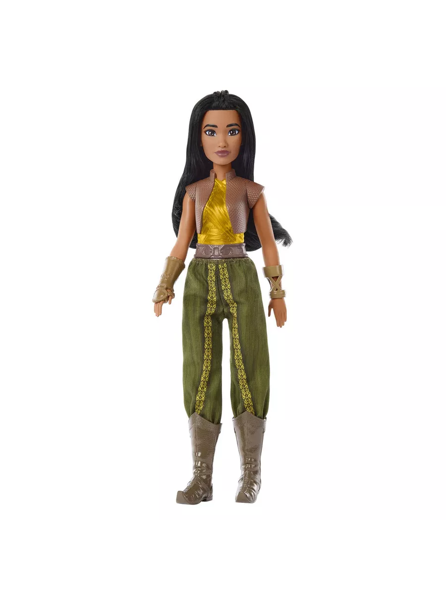 Кукла Райя с прямыми темными волосами — можно сделать прическу. Наряд — топ с укороченным жилетом, пояс и съемные однотонные брюки с принтом. На руках — защитные доспехи. На ногах — сапоги. Подвижные части тела.