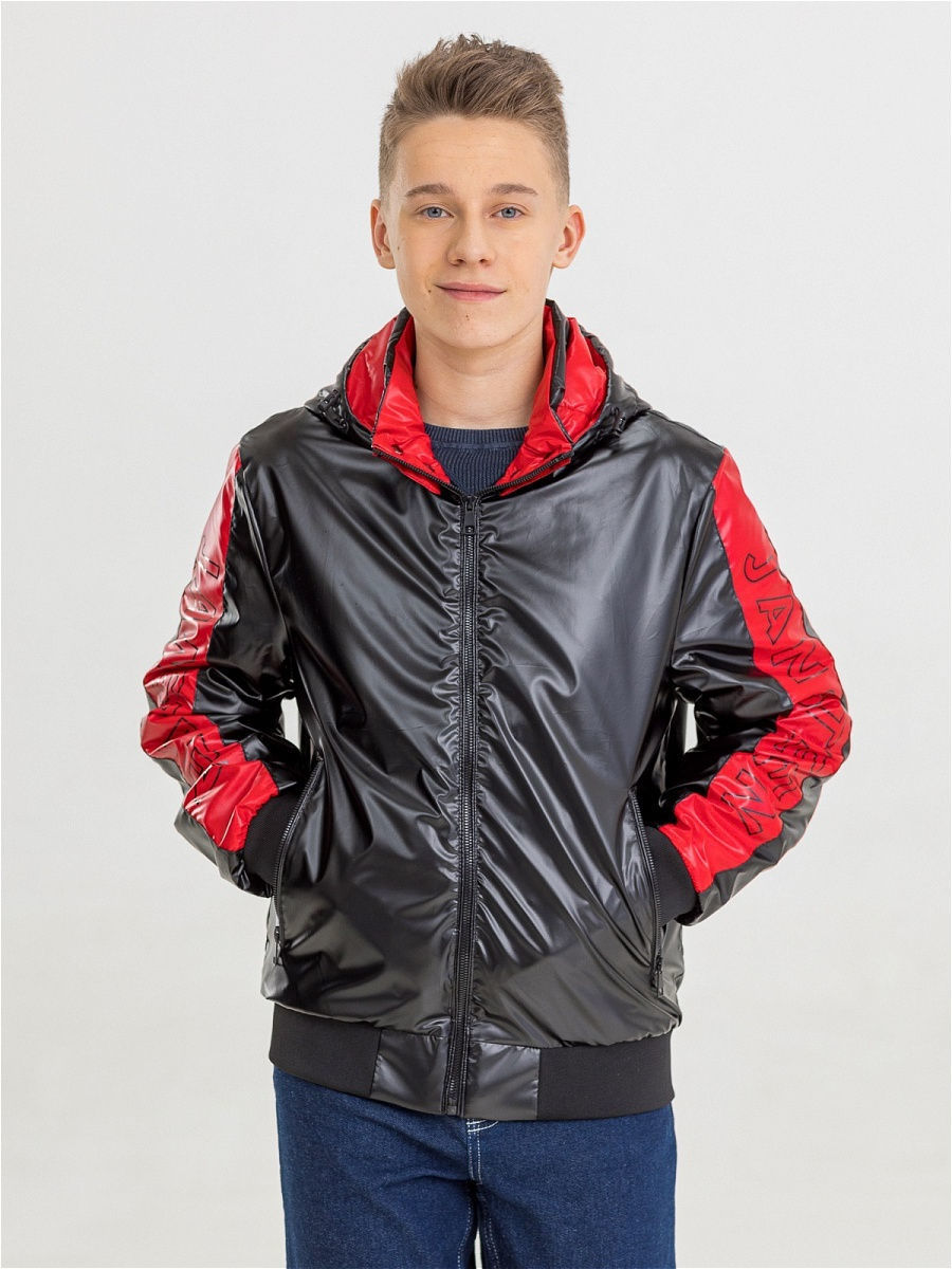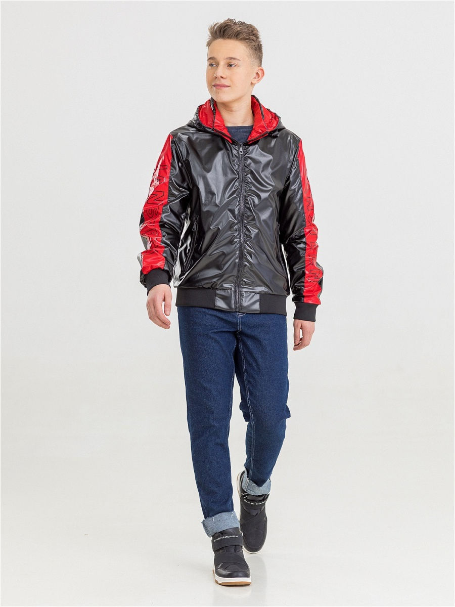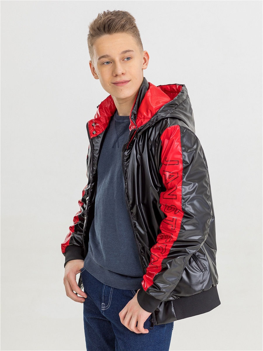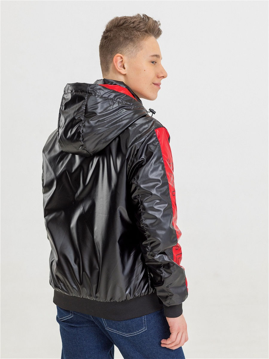 Куртка-бомбер спортивного стиля с широкой резинкой по низу, выполнена из плотной глянцевой ткани с водоотталкивающей пропиткой. Центральная застежка на открытую тесьму-молнию. Рукав втачной с утягивающей резинкой-манжетом. Воротник-стойка, переходящий в капюшон. Капюшон съемный на молнии, с утяжкой по объему. Два прорезных глубоких боковых кармана на молнии. Внутренний глубокий карман. Отделка контрастной тканью. Декоративный накат. В качестве утеплителя используется синтетический наполнитель нового поколения.