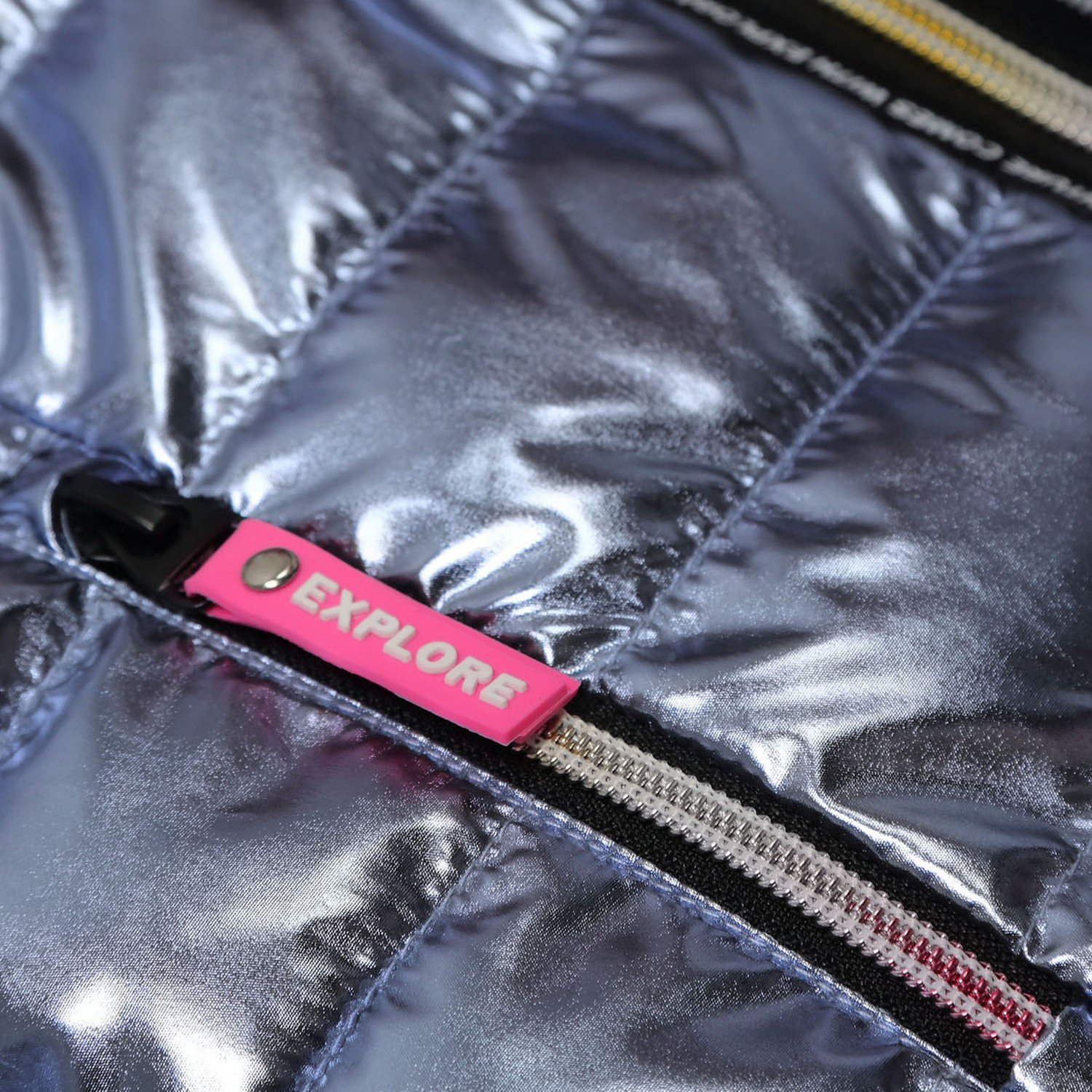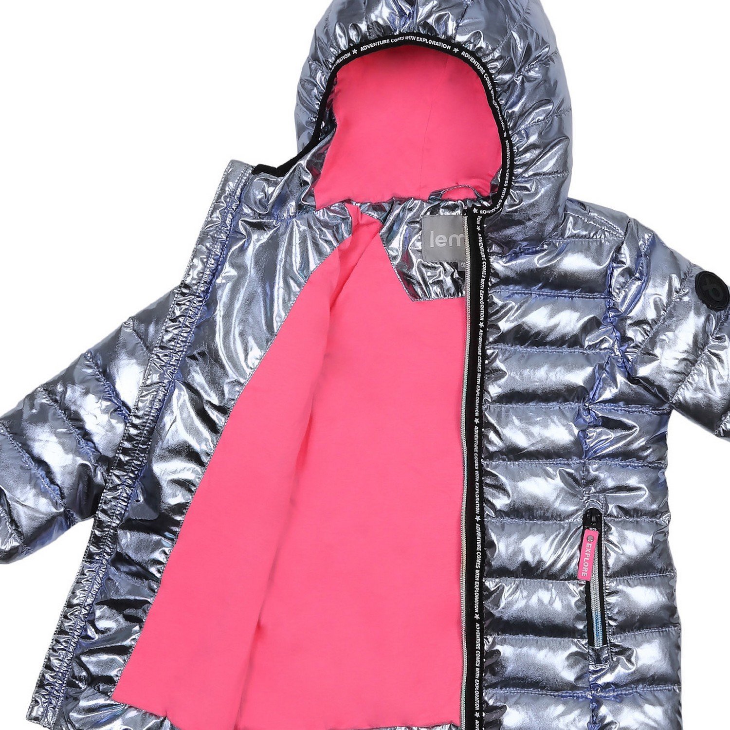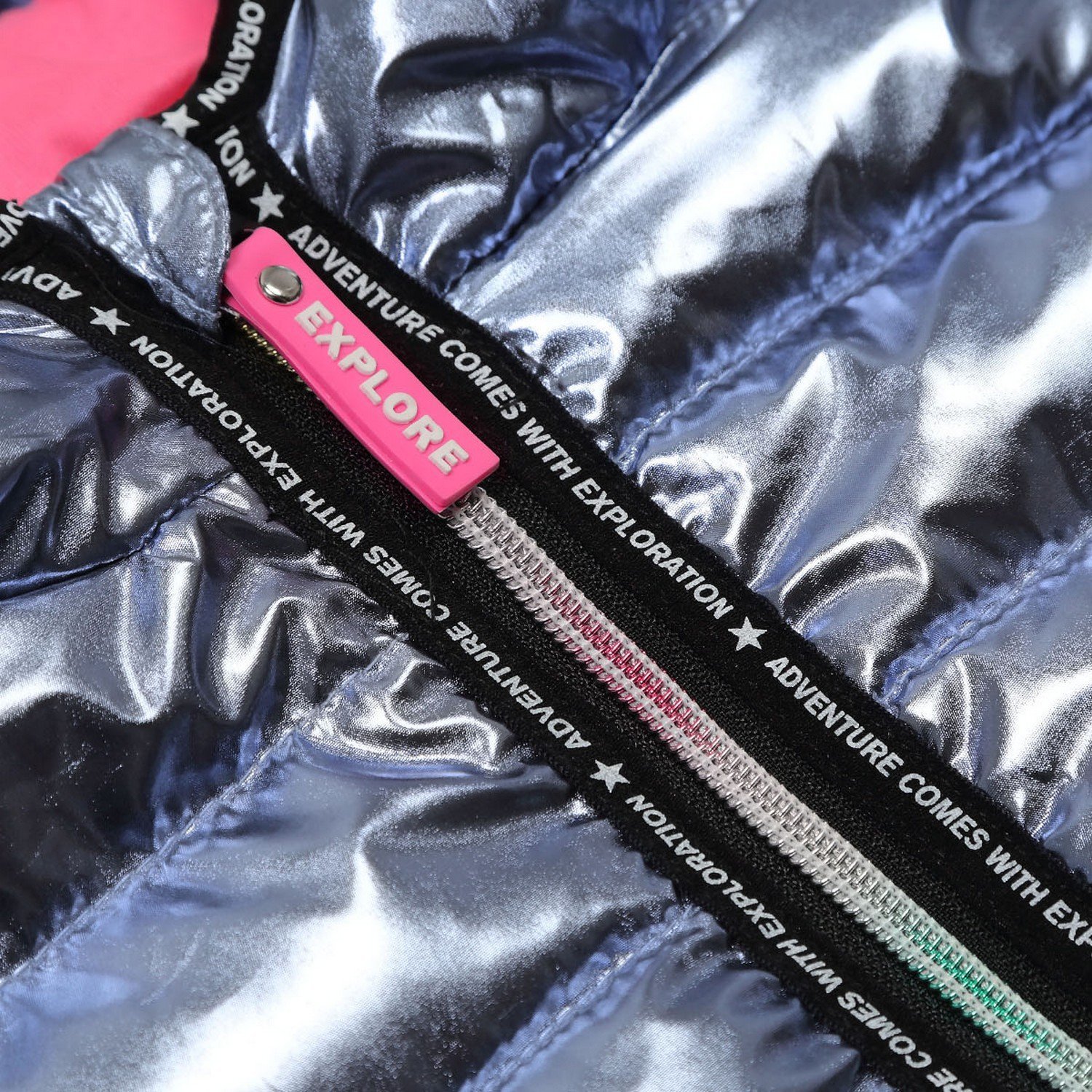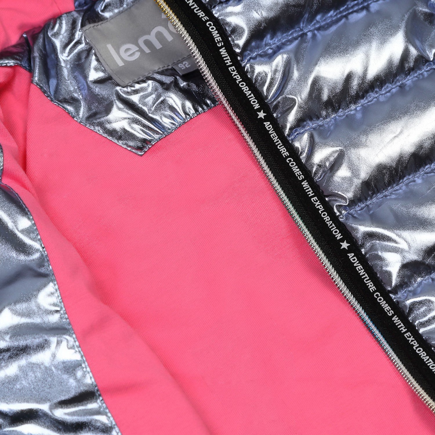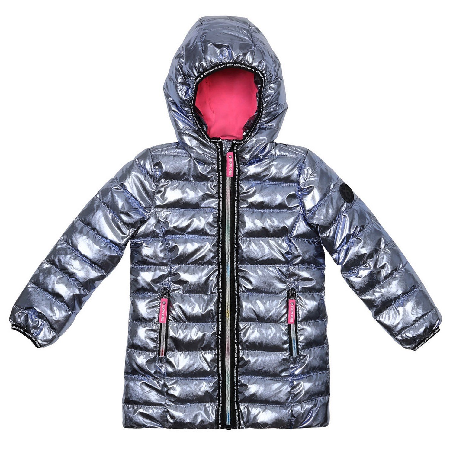 Весенняя стеганая куртка с несъемным капюшоном для девочки. Застегивается на молнию с защитой от прищемления. Модель серебряного цвета с радужными элементами. На корпусе вместительные карманы. Капюшон имеет ярко-розовую подкладку. На рукаве нашивка. Водонепроницаемость - 1000 мм. Начиная с 98 размера подкладка - полиэстер, 92 размер - хлопок.