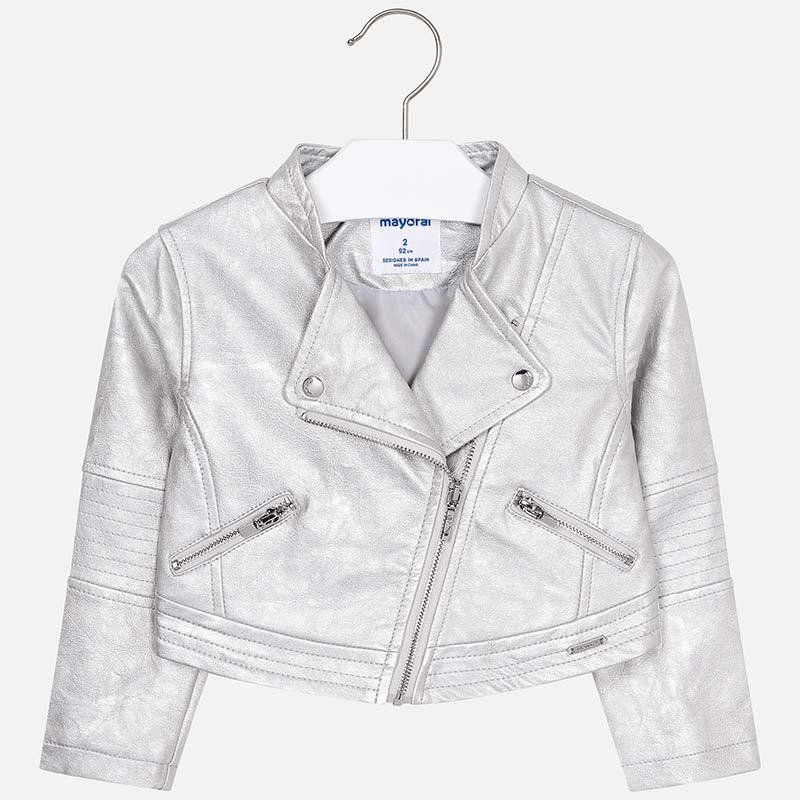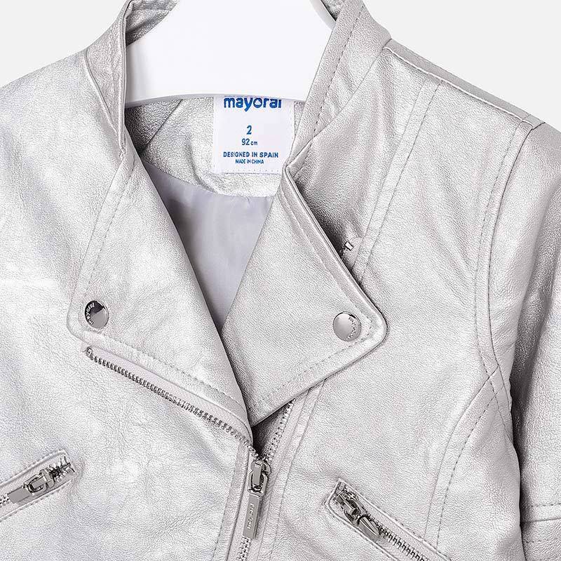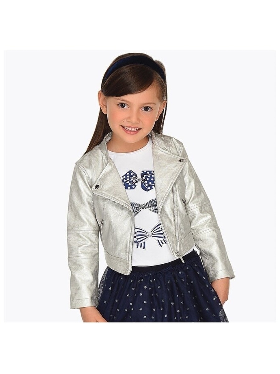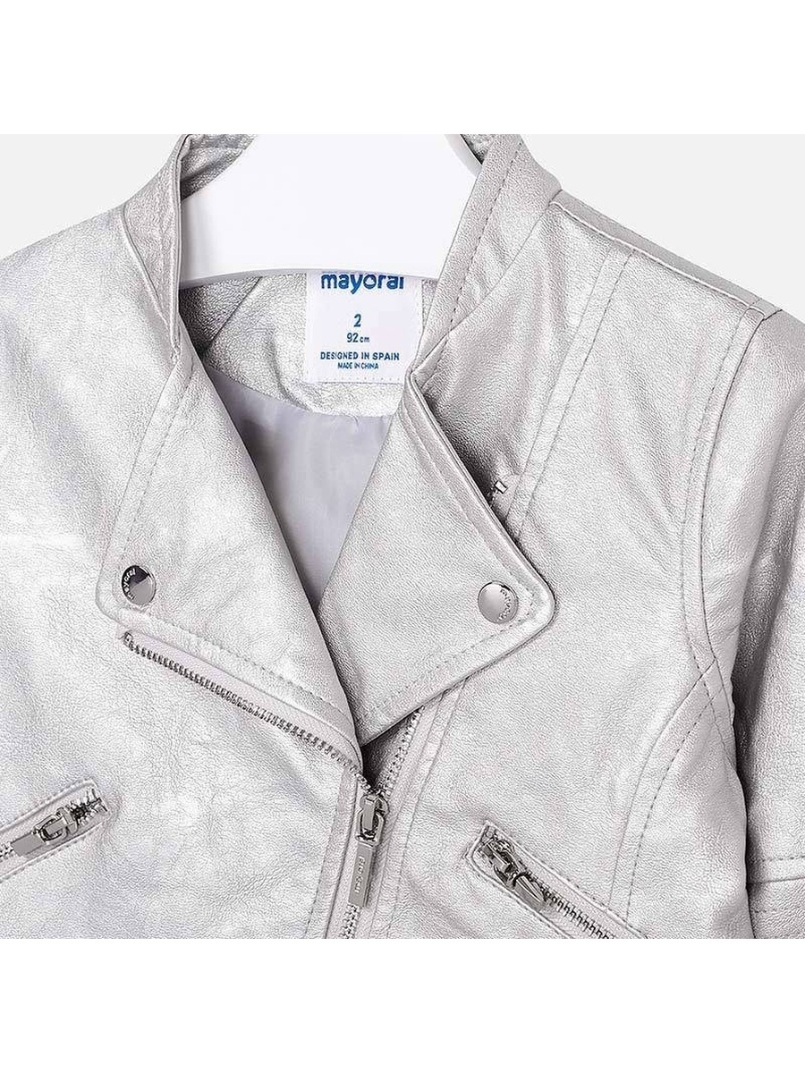 Куртка/жакет с длинным рукавом для девочек на молнии на манжетах. Воротник с клапанами. Передняя центральная молния. Современная ткань из экокожи. Дизайн с асимметричным басом. Карманы по бокам.