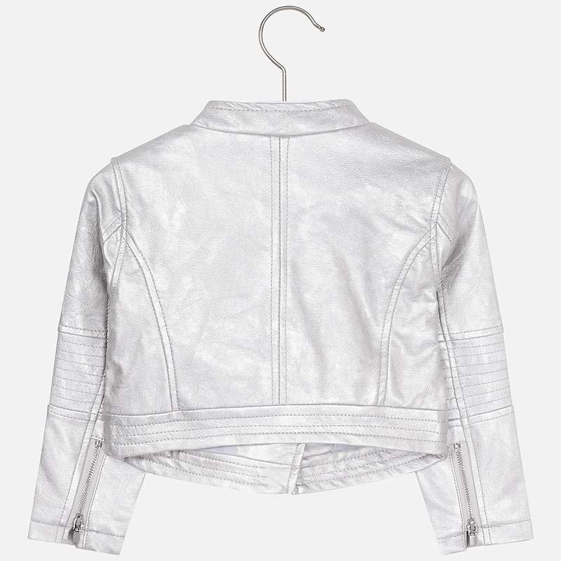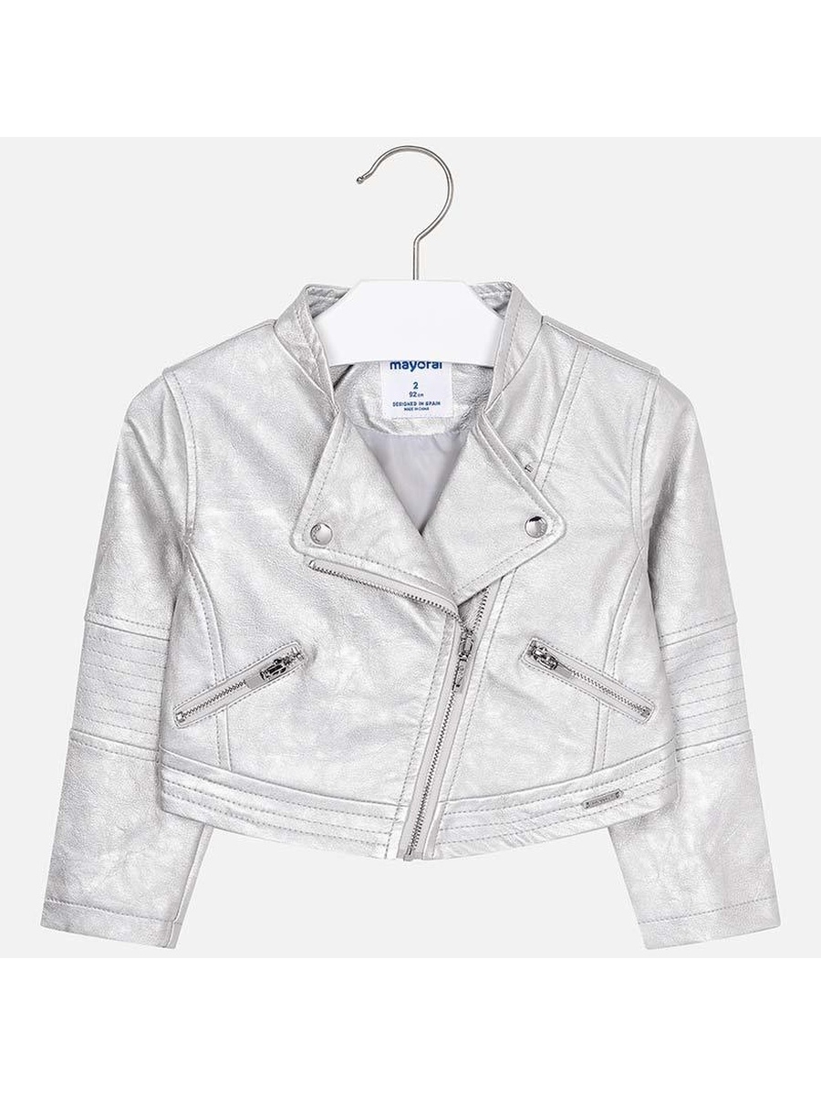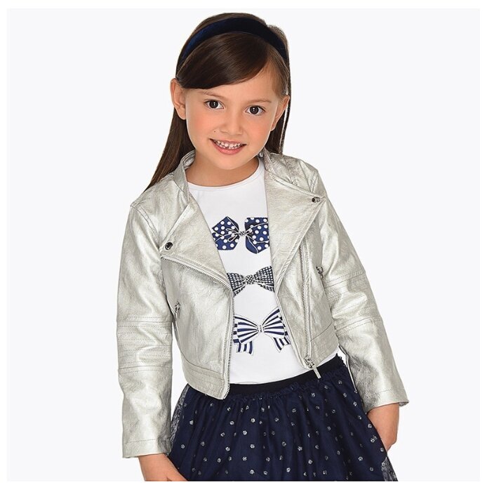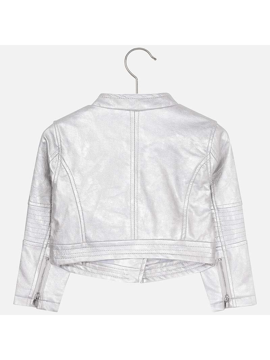 Куртка/жакет с длинным рукавом для девочек на молнии на манжетах. Воротник с клапанами. Передняя центральная молния. Современная ткань из экокожи. Дизайн с асимметричным басом. Карманы по бокам.