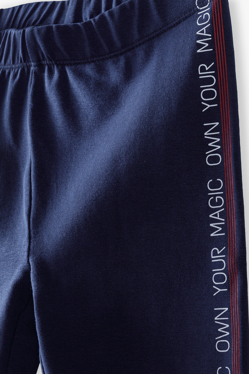 Модель выполнена из хлопкового трикотажа. Детали: - талия на резинке; - леггинсы украшены текстовым принтом по бокам.