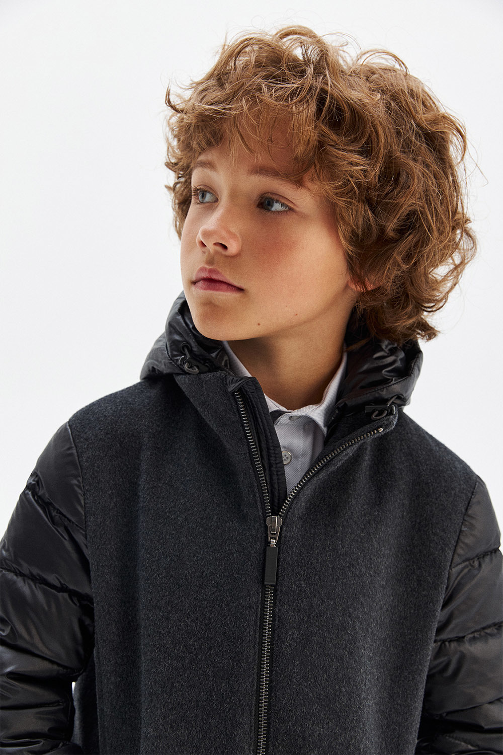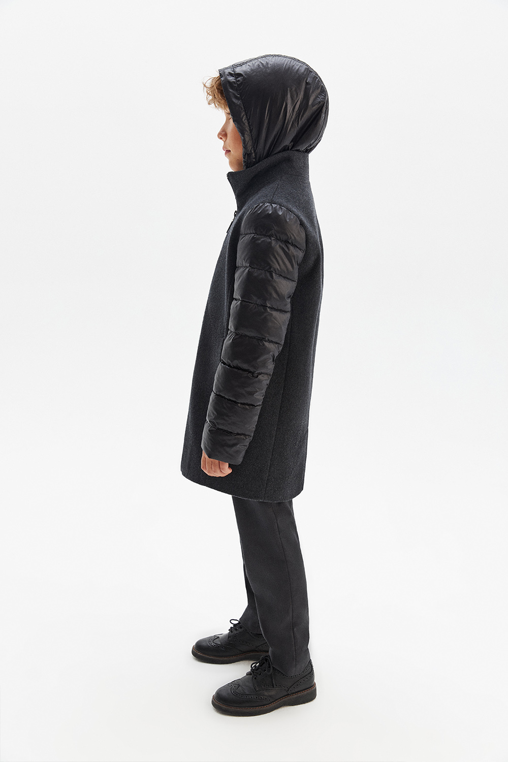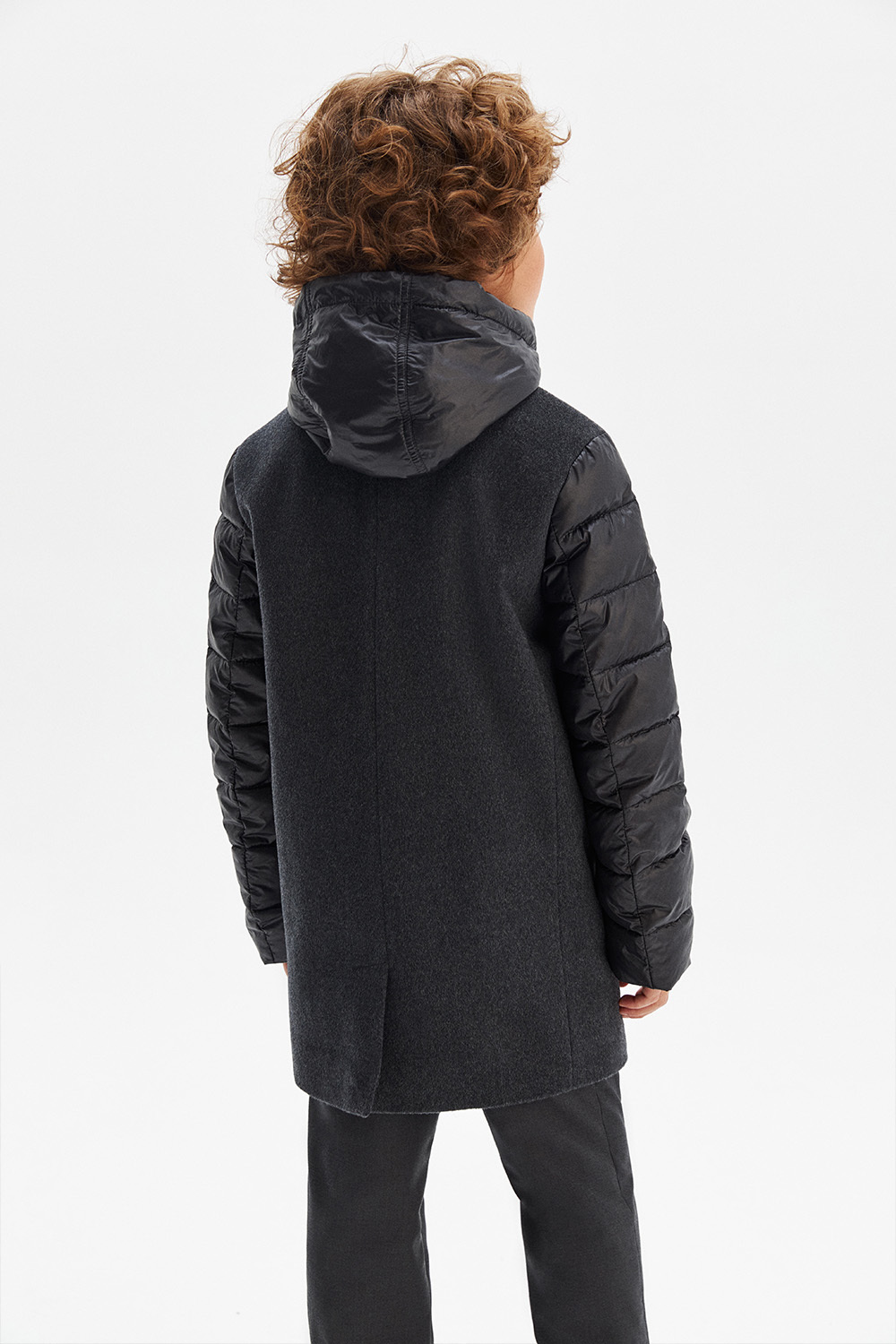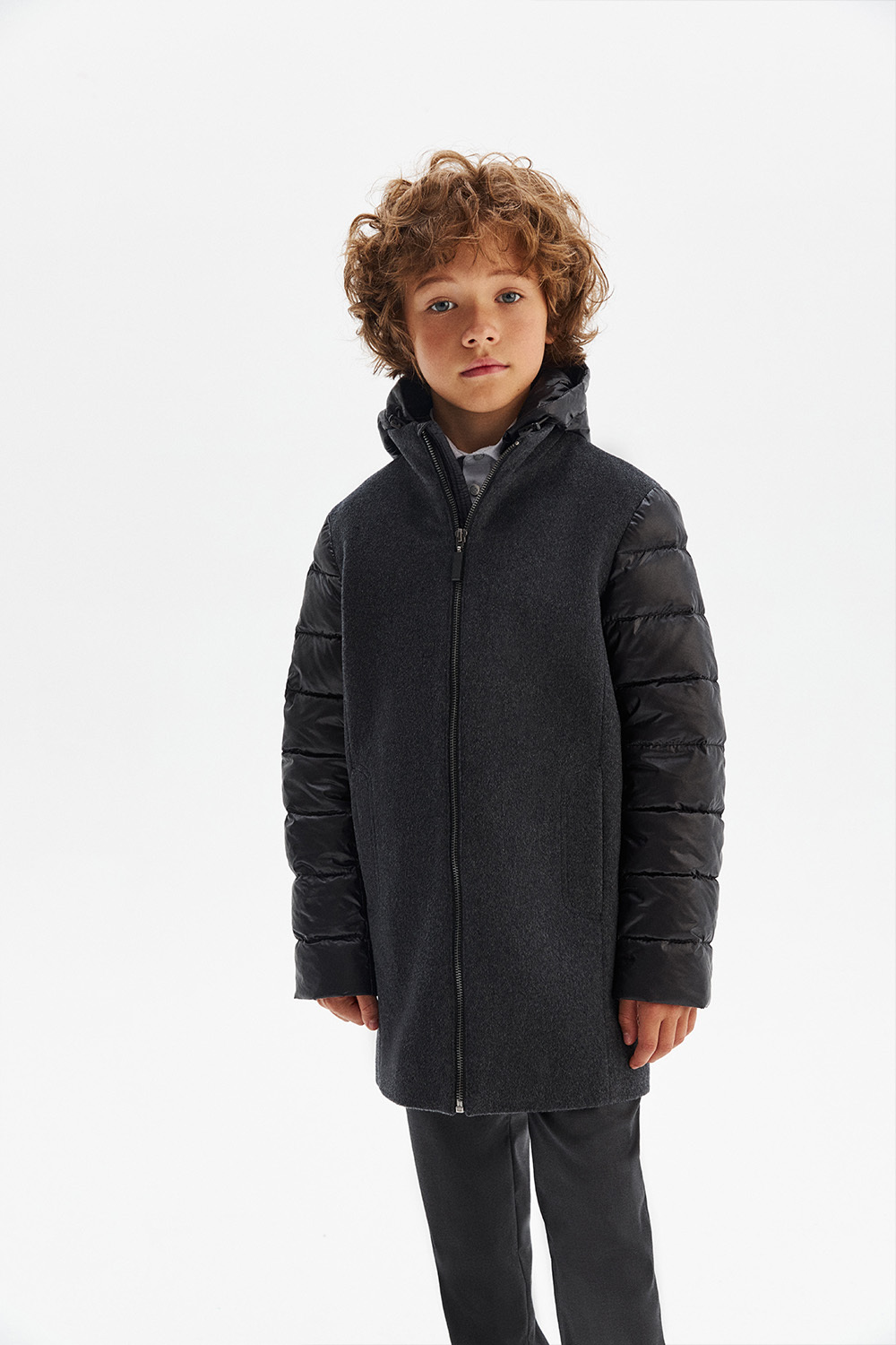 Демисезонное пальто из шерсти. Комбинированная модель: основа модели выполнена из пальтовой шерстяной ткани, а капюшон и рукава из курточной ткани. Съемный капюшон с утяжками. Шлица на задней части подола. Стеганые рукава. Удобные карманы. Застежка на молнию с защитным уголком. Ветрозащитная планка под молнией. Петля-вешалка внутри. Ткань обработана специальными пропитками: PU - не пропускает воду и WR - позволяет каплям скатываться с поверхности изделия. Наполнитель в рукавах - био-пух. Био-пух гипоаллергенный утеплитель, который эффективно защищает от холода и влаги. Подкладка выполнена из воздухопроницаемой, гигроскопичной ткани с высоким содержанием натуральных волокон. Температурный режим: от +5 до +10; * Температурный режим зависит от количества слоев одежды, возраста ребенка, влажности воздуха и скорости ветра.