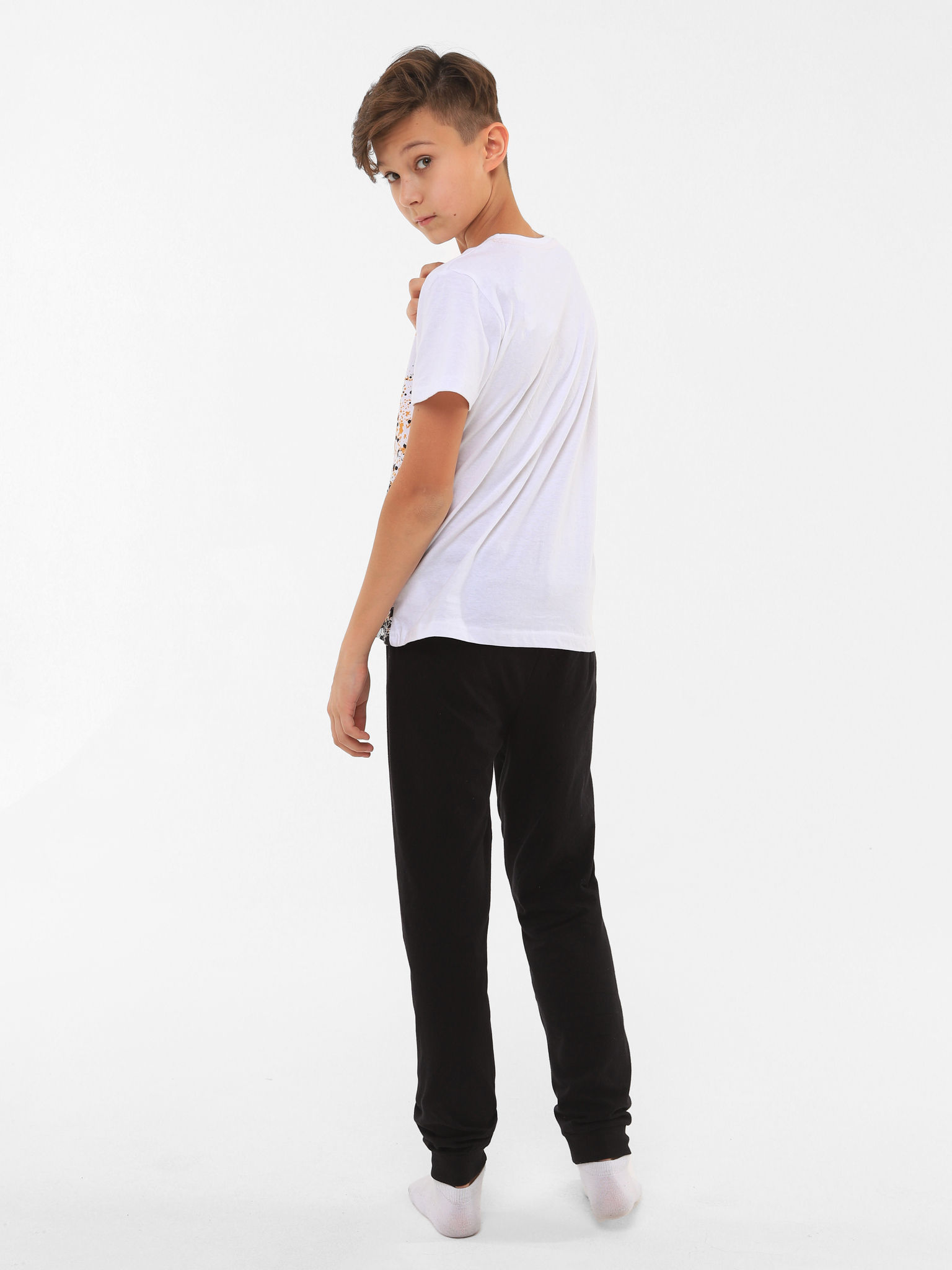 Пижама для мальчика, состоящая из футболки и брюк, выполнена из гипоаллергенного хлопкового трикотажа с использованием безопасных красителей. Футболка имеет круглый вырез горловины, короткие рукава и украшена оригинальным принтом и надписью. Брюки имеют комфортную резинку со шнурком на талии. Края штанов с мягкими трикотажными манжетами. Удобный крой детской пижамы позволяет чувствовать себя свободно и уютно, мягкая ткань приятна к телу. Комплект идеален для сна, в качестве домашней одежды, для дачи, а также станет отличным подарком для ребенка. Удобен в носке и в уходе.
