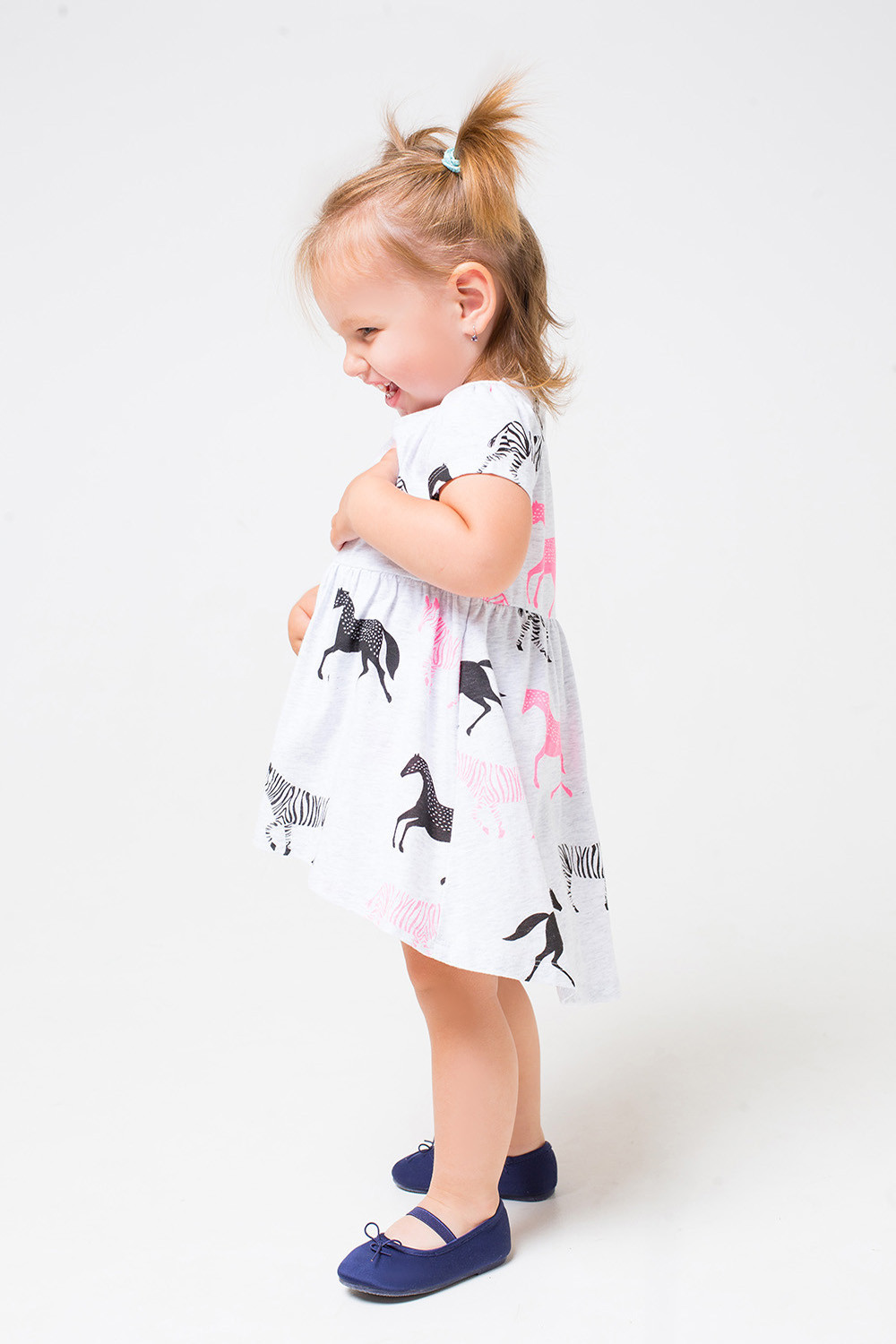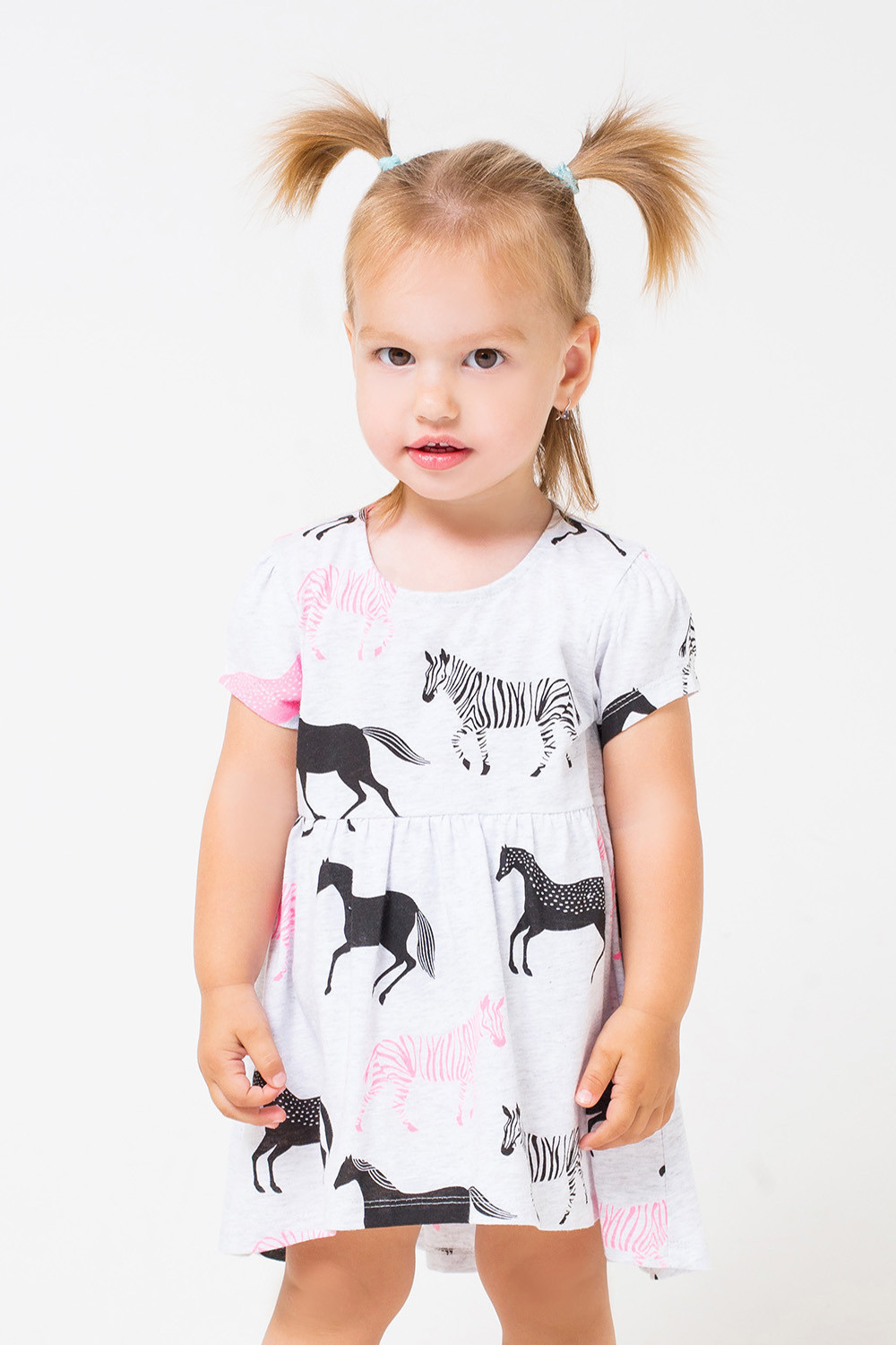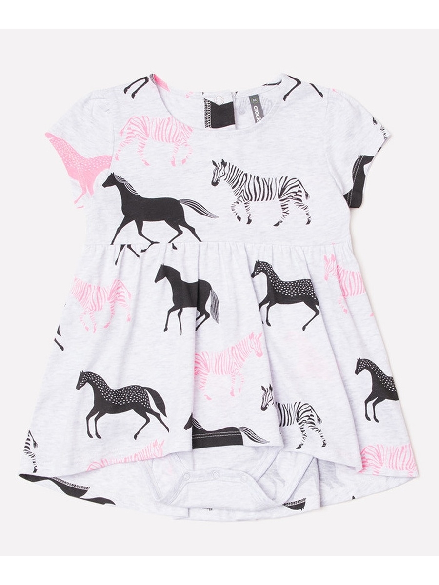 Платье-боди из меланжевого трикотажа супрем с набивным рисунком. Отрезная юбка на сборке, спинка длиннее переда. Короткие втачные рукава с небольшой сборкой по окату. Обработка горловины внутренним кантом. В области спинки и в шаговом шве застежки на кнопки-ободок.