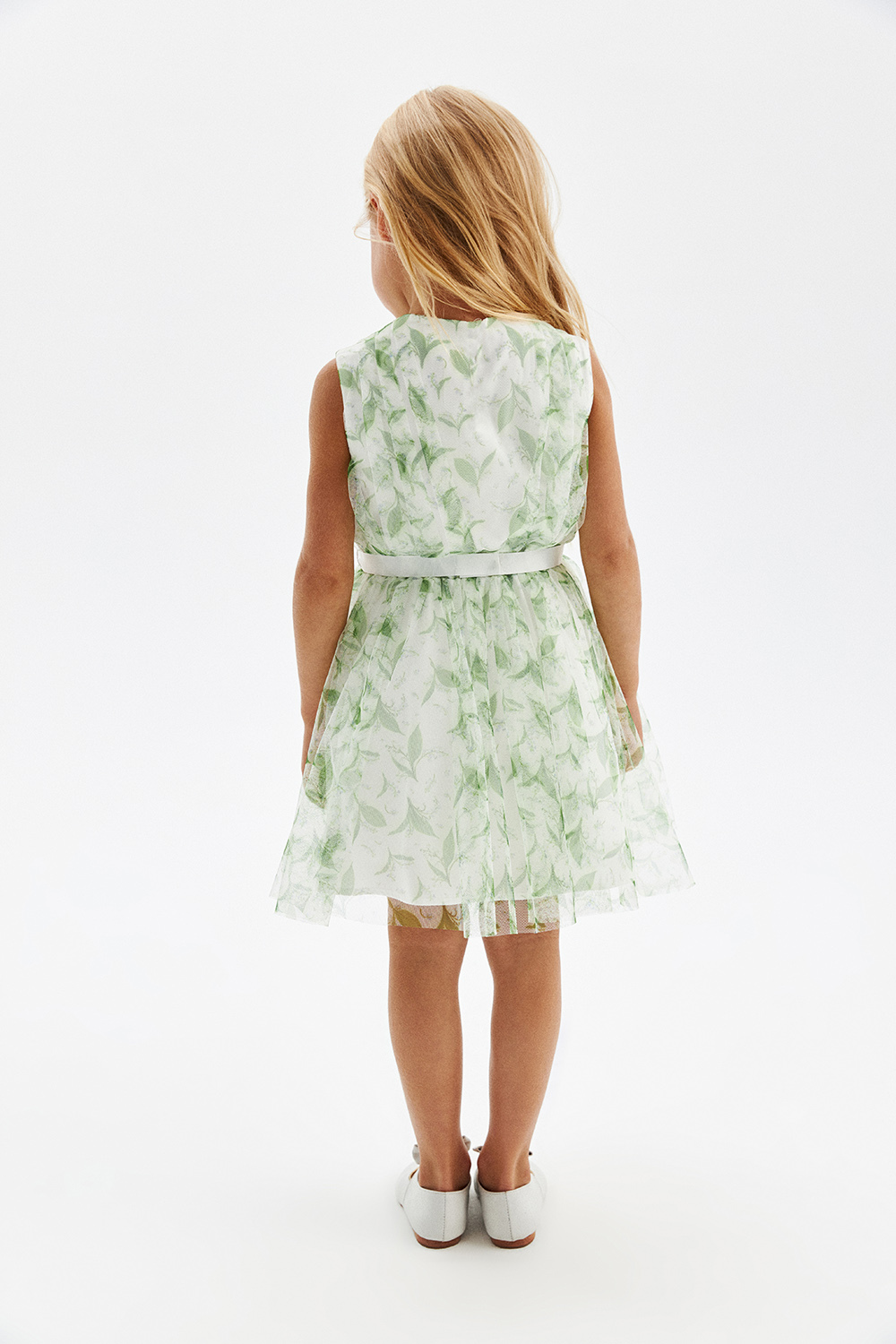 Силуэт baby doll длиной до колена; Стильное сочетание основной ткани и изысканно задрапированной полупрозрачной сетки с принтом ландыши. Подкладка из приятного к телу хлопка с добавлением эластана; Съемный пояс из репсовой тесьмы с бантом, фиксируется в незаметных петлях. Застегивается на кнопку; Юбка внутри на резинке, что обеспечивает идеальную посадку; Застежка на пуговицу.