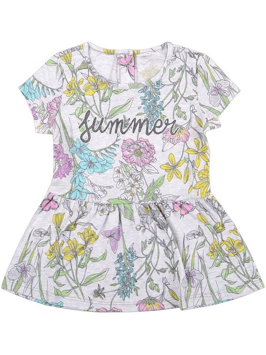 Платье из набивного полотна с рисунком "Летние цветы", короткий втачной рукав, по горловине кант, по спинке застежка на 2 кнопки. Юбка отрезая со сборкой, на полочке принт "Лето".