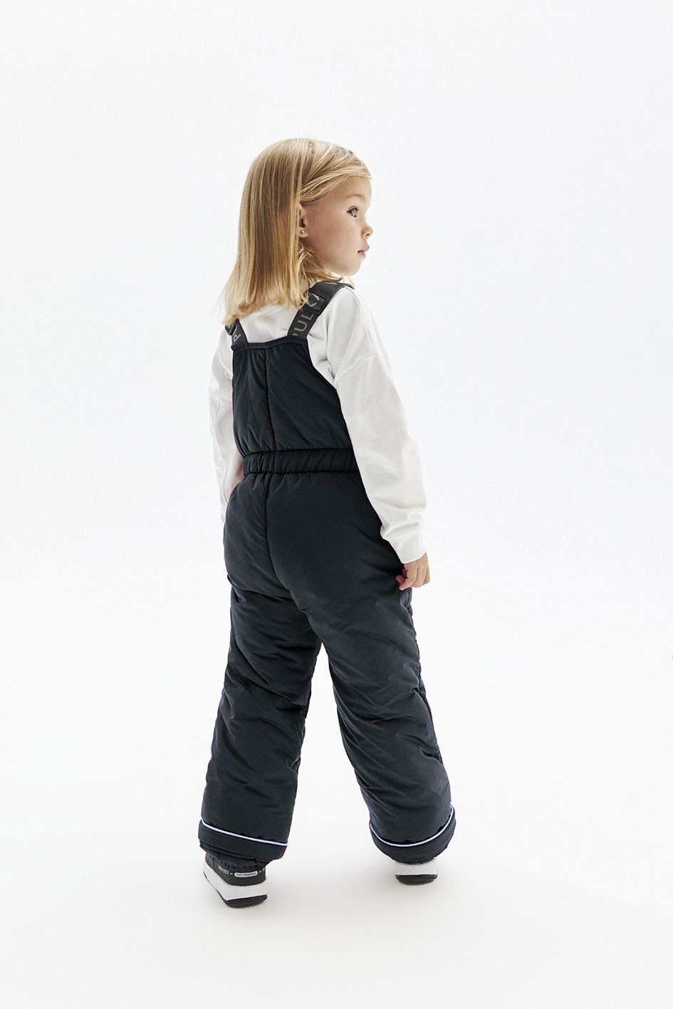 Ткань: верх - плотная и прочная курточная ткань с водоотталкивающей и водонепроницаемой пропитками, подкладка верха - хлопковый трикотаж, низ - поливискоза; Наполнитель 180 г/м² (два слоя пластового утеплителя микроволокна); Регулируемые съемные бретели; Резинка по талии сзади – комфортное прилегание; Удобные карманы; Ветрозащита по низу брюк на липучке "velcro"; Светоотражающий кант по низу брюк; Подклад карманов - теплый флис.