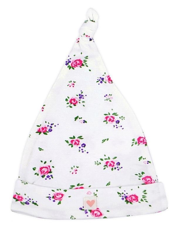 Шапка детская с отворотом, из интерлока с цветочной набивкой, верхняя часть оформлена в узелок. Жаккард на отвороте.
