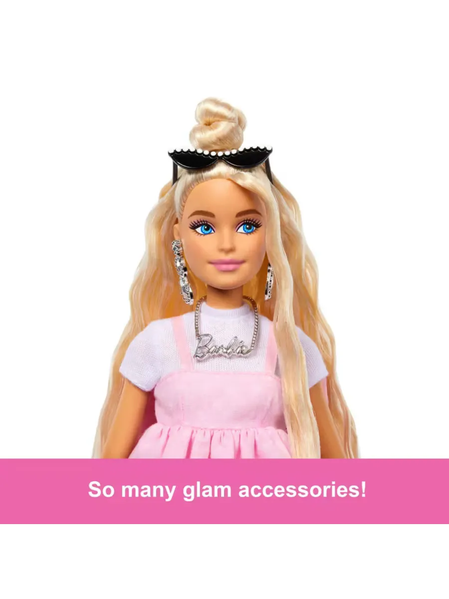 Эта кукла, одетая в фирменный розовый цвет Барби, имеет волнистые светлые волосы, собранные в пучок на макушке!