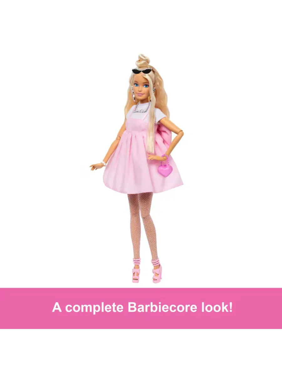 Кукла Барби дополняет свой наряд эффектными украшениями, жемчужными солнцезащитными очками, сумочкой в форме сердца и туфлями с ремешками и бантом. Гибкие суставы позволяют ей принимать самые разные позы!