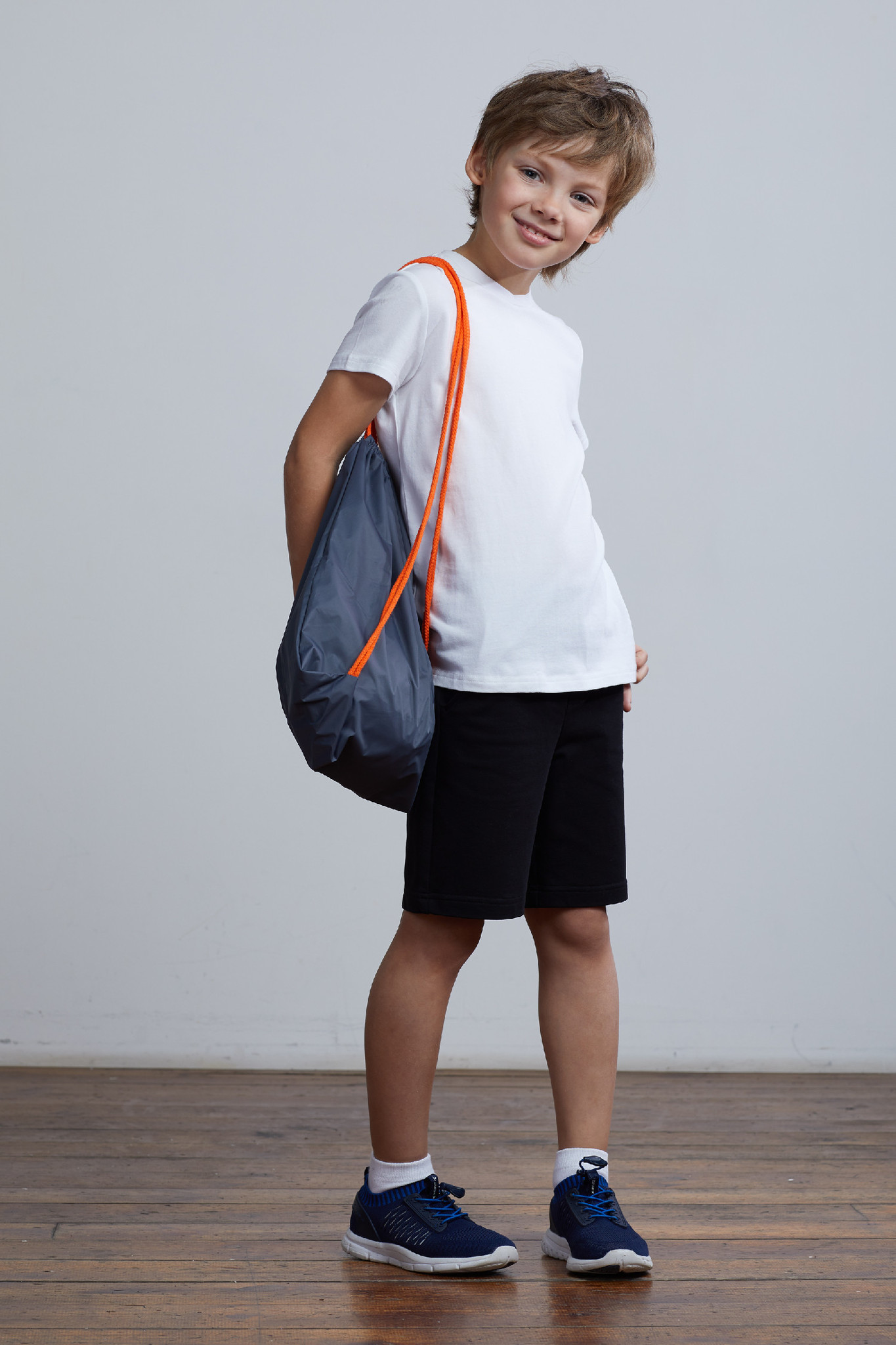 Комплект для занятий физкультурой; Базовая футболка и шорты с карманами из плотного, воздухопроницаемого и приятного к телу трикотажа; Брэндированная сумка-мешок из прочной плащевой ткани с контрастным шнуром. Удобные вещи, в которых ребенку будет комфортно двигаться.