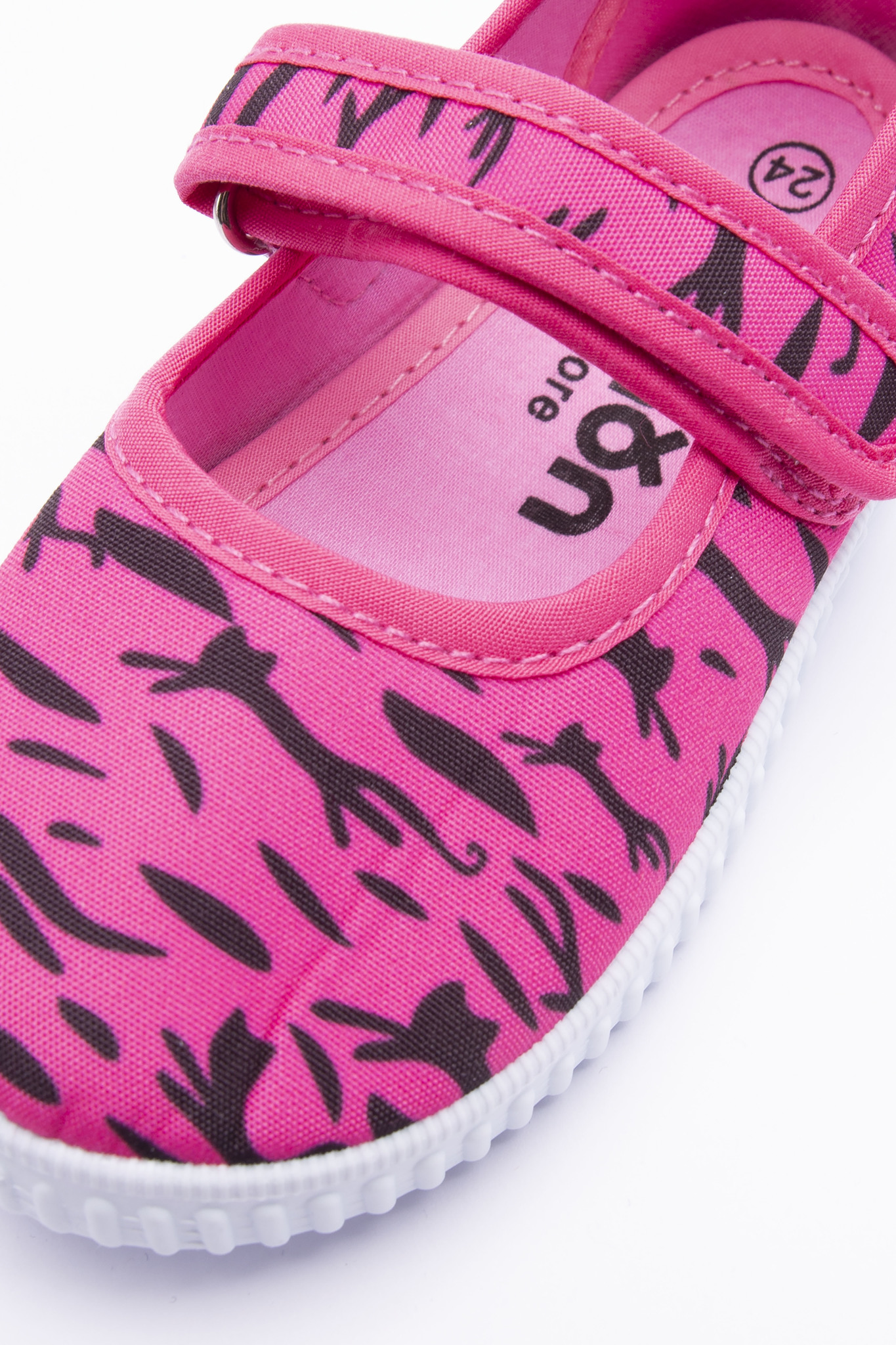 Туфли цвета фуксии для девочки. Модель фиксируется застежкой-липучкой. Дизайн дополнен звериным принтом. Верх выполнен из дышащего текстиля. Фактурная подошва из термопластичной резины гарантирует устойчивость и комфорт.