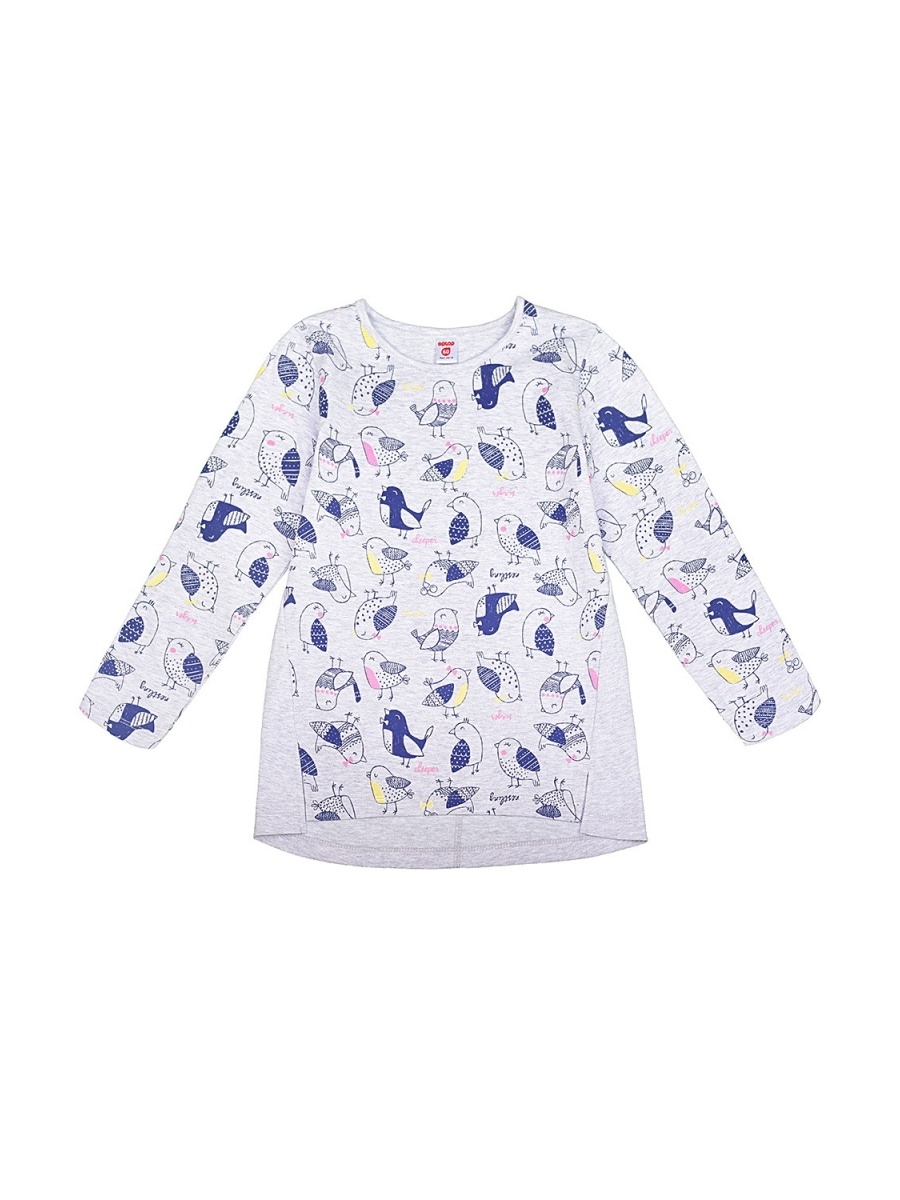 Туника для девочки из супрема, длинные втачные рукава, боковые швы смещены на полочку и заканчиваются разрезами, низ спинки оформлен длиннее полочки. Спинка и кант по горловине из однотонного супрема, остальные детали из набивного. Возможна печать на полочке. В размерах 52/92 и 56/98 застёжка на 2 кнопки в плече. По середине спинки декоративная строчка, имитирующая средний шов.