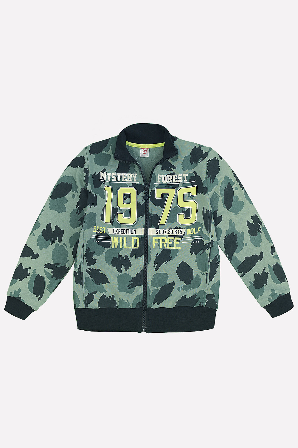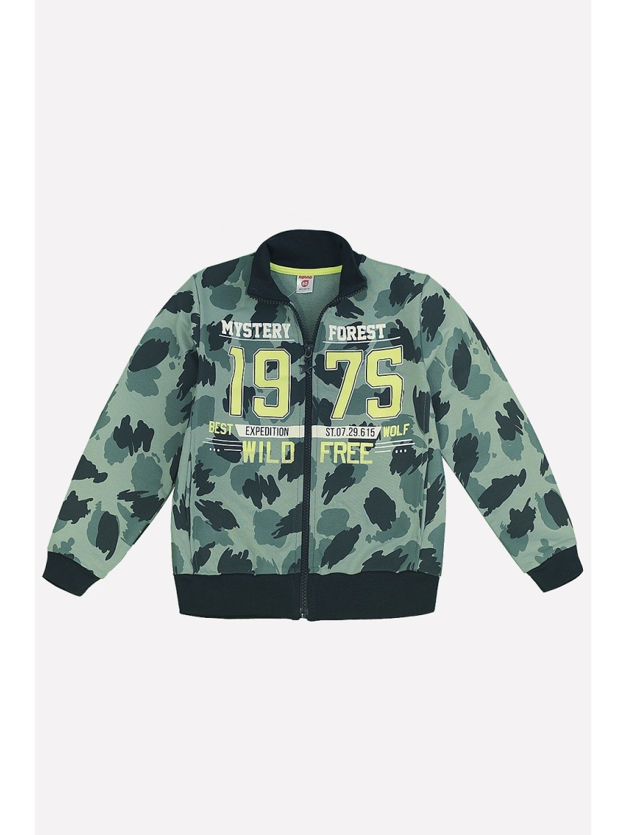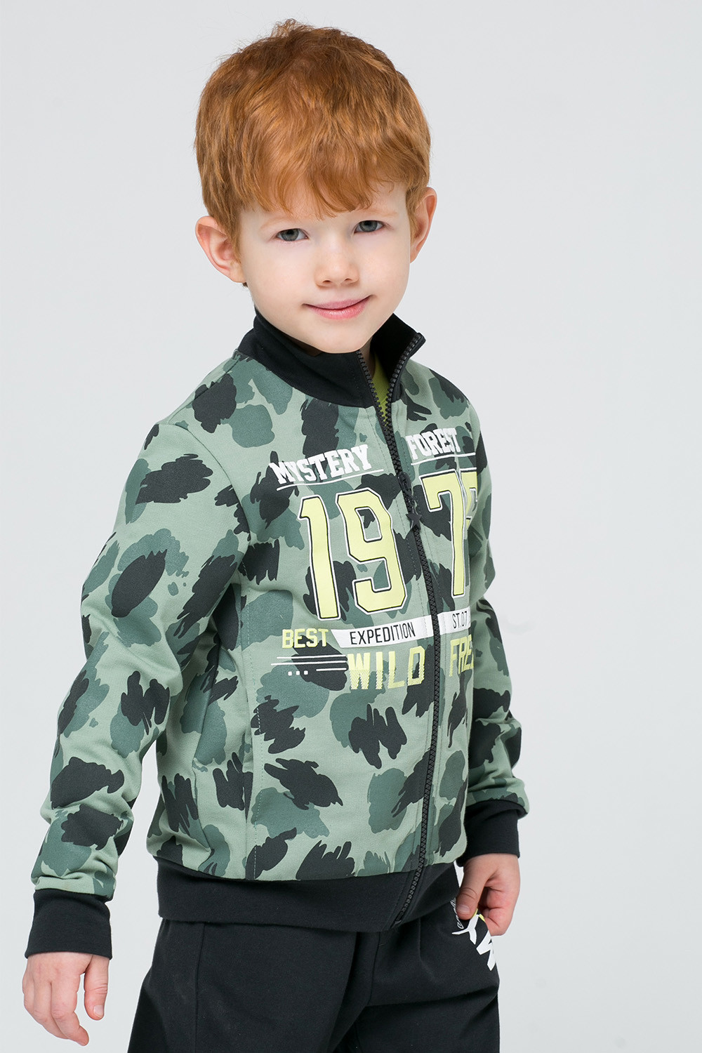 Жакет для мальчика из футер-петли или футер начёса, длинные втачные рукава, застёжка на замке-молнии, воротник стойка, на полочке отрезные бочки с внутренними карманами в швах. Пояс и манжеты из кашкорсе, на полочке печать. Рукава могут быть из отделочного полотна, а стойка возможна из кашкорсе.